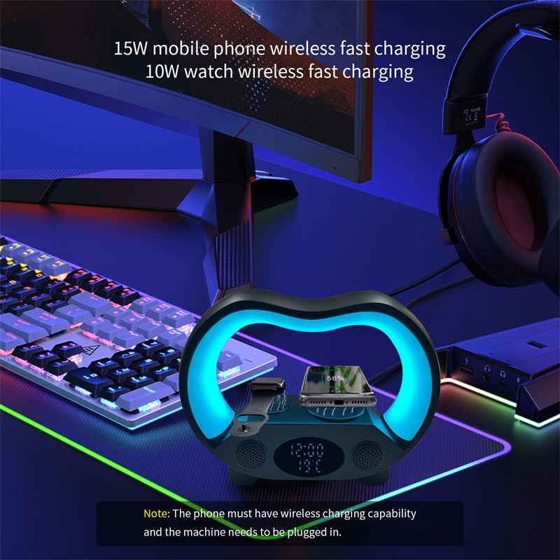 Introducing the Smart LED Lamp with 6 in 1 multi-function features. This wireless charging atmosphere light includes 15W wireless fast charging, Bluetooth audio, clock, alarm clock, temperature display, 19 unique lighting modes, and a stylish Apple-inspired design. The device brings modern convenience and style to your living space.