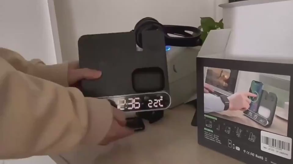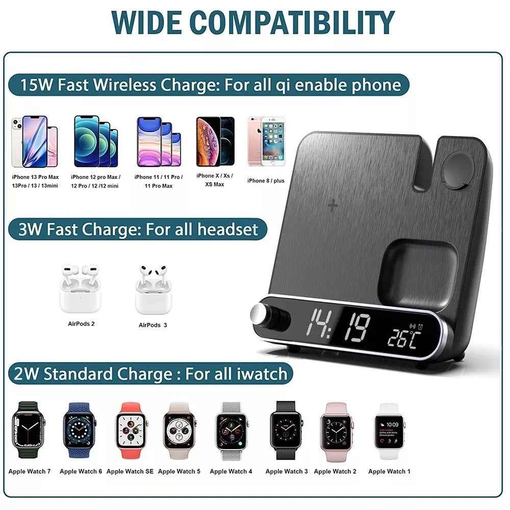 This innovative device combines multiple functions into one sleek design. It features a high-quality Wireless Alarm Clock with a built-in 3-in-1 wireless charging station. This device is designed to charge your watch, phone, and earphones simultaneously with fast and stable power output.