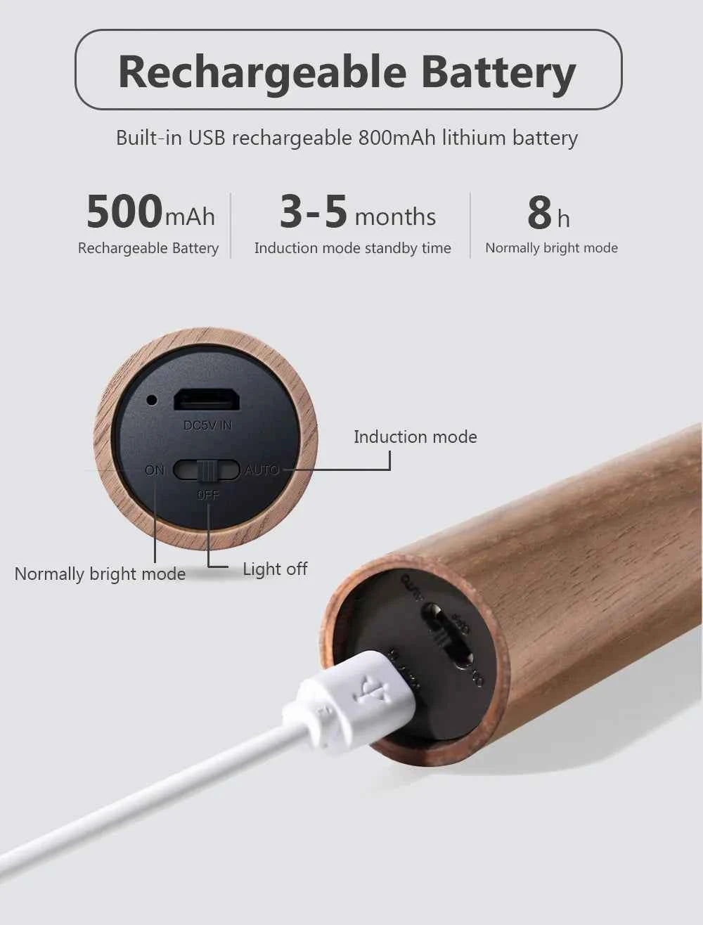 Charging the USB night light is straightforward with USB charging capability. The built-in lithium battery has a 500mAh capacity which supports long-lasting usage. The induction mode can operate for about half a month on a single charge, making it highly efficient for daily use. This makes it perfect for bedrooms, hallways, kitchens, or any area requiring gentle illumination at night.