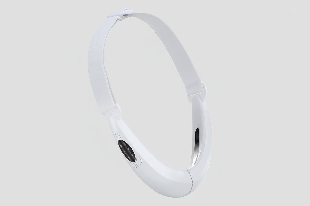 These close-up images from different angles showcase the modern design and practical usage of the Facial lifting device. The device comfortably fits around the chin and jawline to deliver precise therapy and maximum results.